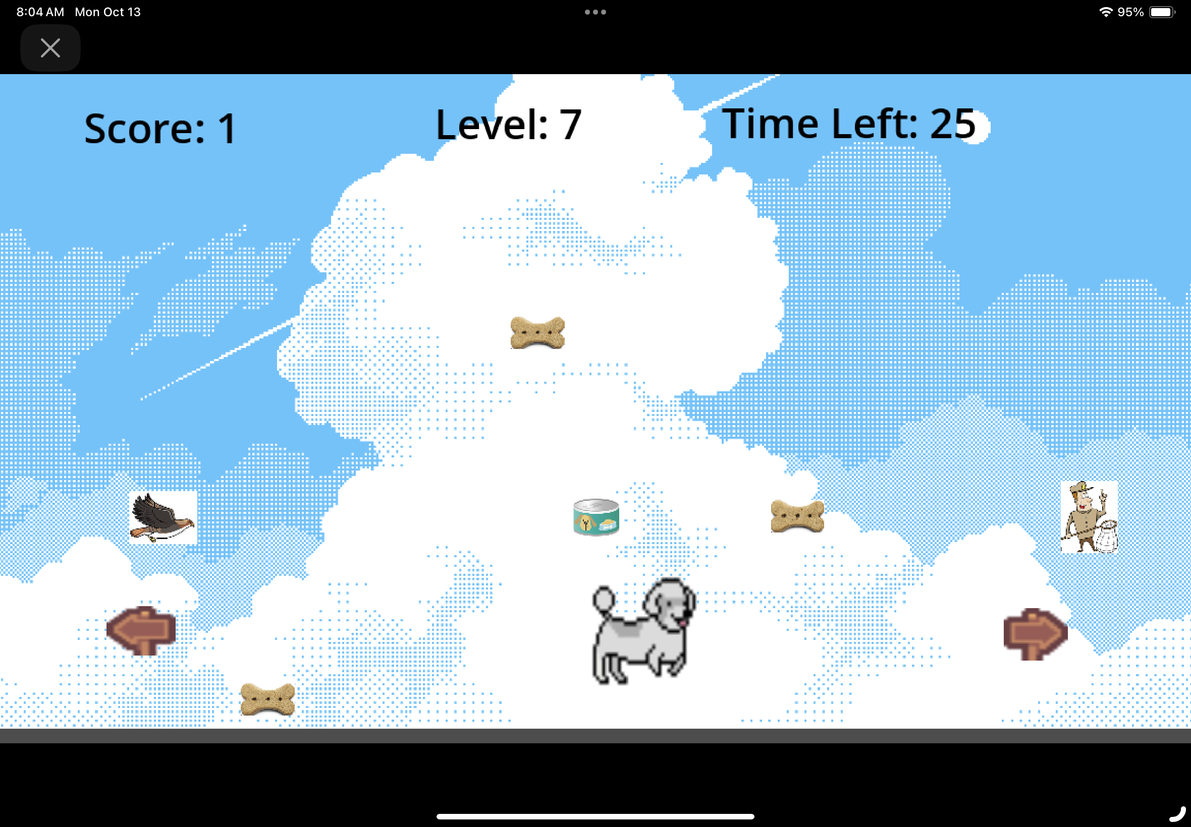 Now rewritten using the godot engine. The objective is to move Luke back and forth so he catches bones and cans which add to the score and to avoid dog catchers and hawks which subtract from the score. If you get 15 points within 30 seconds, you move to the next level. If you don’t get 15 points in 30 seconds, you replay the existing level. You can continue to play to see how many levels you can reach. There is currently no specific end.